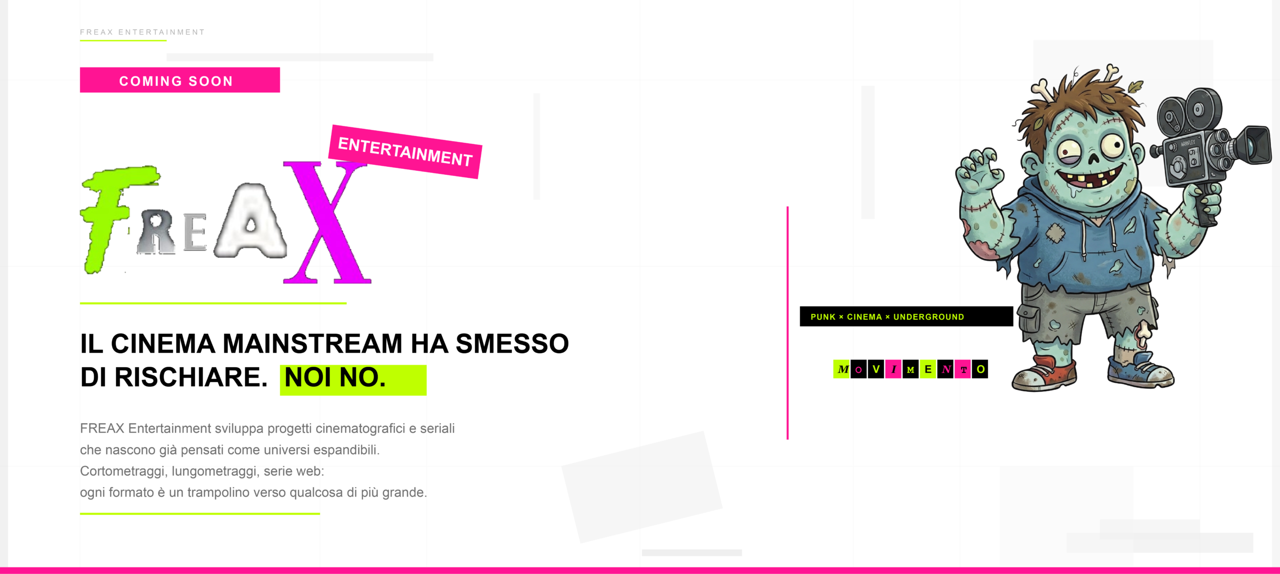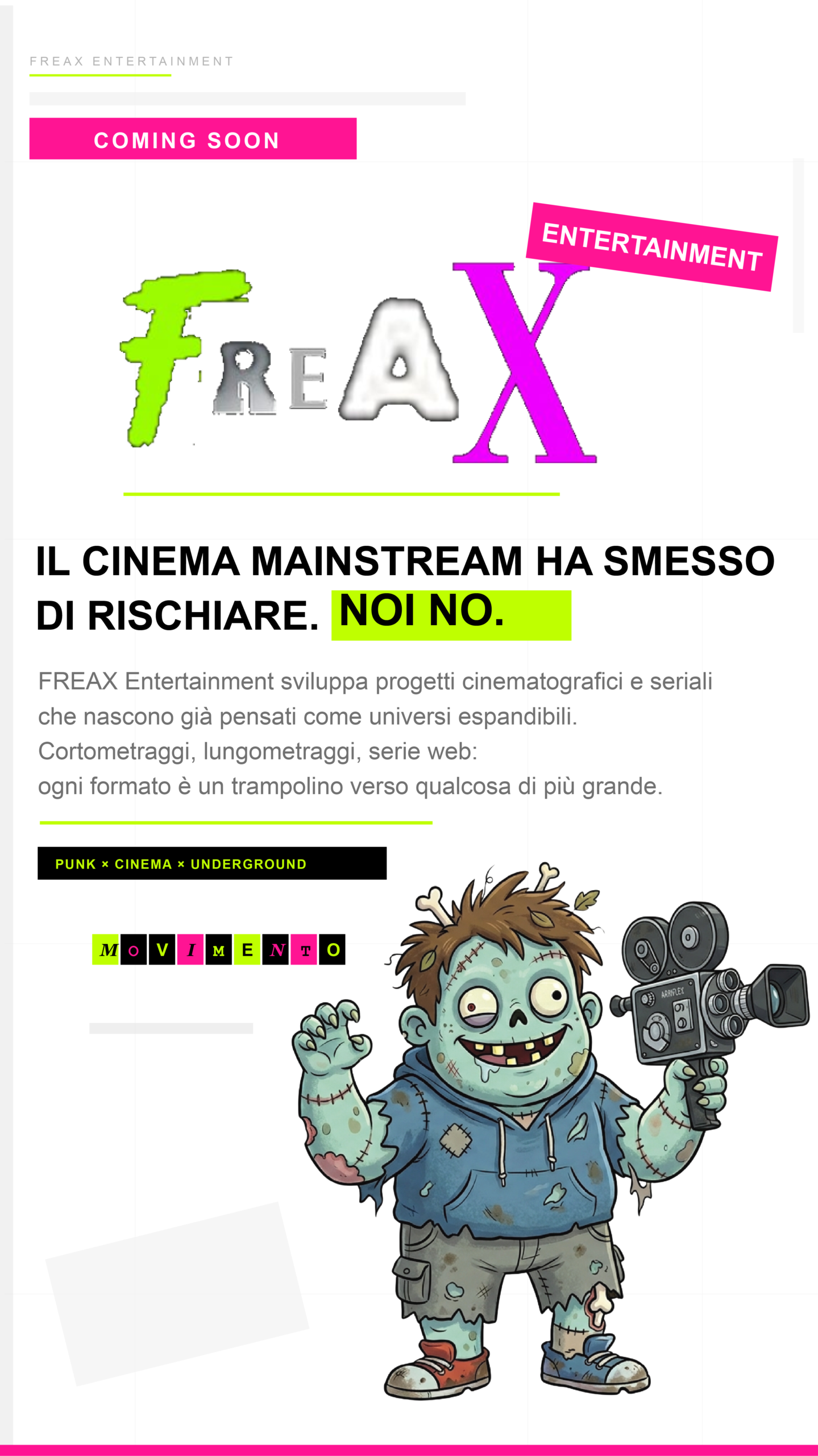 FREAX entertainement sviluppa progetti cinematografici e seriali che nascono già pensati come universi espandibili. Cortometraggi, lungometraggi, serie web: ogni formato è un trampolino verso qualcosa di più grande.